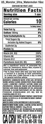 - Energy Boost: Packed with Monster’s signature energy blend, Ultra Watermelon delivers a quick and effective energy boost. Caffeine, taurine, and B vitamins work together to enhance alertness and combat fatigue, making it an ideal choice for active individuals and those needing an energy pick-me-up.