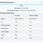 Vanilla Flavour: Whey Protein Isolate (Milk) [contains Emulsifiers; Soy Lecithin, Sunflower Lecithin] (96%), Flavouring, Sweetener (Sucralose).