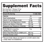 BCAA Blend (L-Leucine, L-Isoleucine, L-Valine) (Soy Lecithin), Natural & Artificial Flavors, Citric Acid, Malic Acid, Bakers Yeast Beta Glucan (Wellmune ), Rhodiola Extract (Root), Sodium Chloride, Tartaric Acid, Potassium Chloride, Magnesium Oxide, Soy Lecithin, Calcium Silicate, Silicon Dioxide, Sucralose, Ascorbic Acid, Red 40, Blue 2.